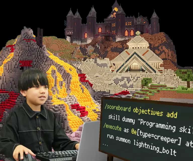 「コマンド エクストラ」は、小学5年生以上向けのコマンドプログラミング上級コース。 /scoreboard や /execute 、 /function などの高度なコマンドを使い、ボスバトル・ゲーム開発・アドオン制作などの、さらに高度なプログラミングに挑戦します。マイクラの世界でコマンドを極め、本格的なプログラミングスキルを身につけよう!